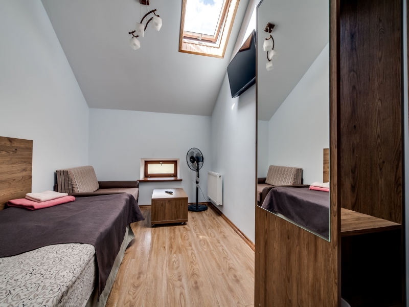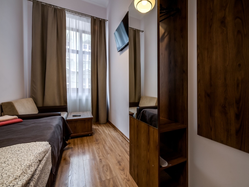 Номер з одним двоспальним або двома окремими ліжками з ортопедичним матрацом, кутовий розкладний диван, класична шафа для одягу, дзеркало, письмовий стіл з вбудованим міні-холодильником, журнальний столик, крісла